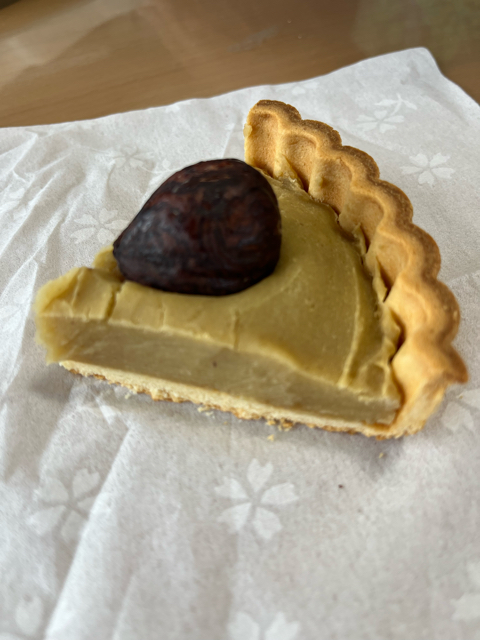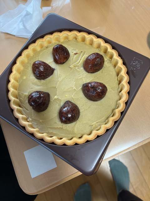 市販のタルト生地に、マロンペーストを塗って栗の渋皮煮をセット。180℃のオーブンで20分。