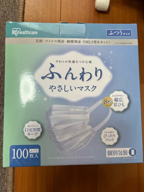 アイリスオーヤマの「ふんわり やさしいマスク」ふつうサイズです。