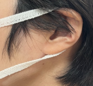 マスクをするときに両耳にマスクのゴムをかけることになりますが、マスクのサイズが合わなかったりすると耳が強く引っ張られることがあります。耳についている筋肉には側頭筋という頭の側頭部についている筋肉があります。ゴムをかけていると、その側頭筋が引っ張られて負荷がかかり、さらにはアゴや首回りのこりが引き起こされることになるのです。こういった頭を支えている筋肉の血流障害が、頭痛の原因になるのです。