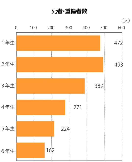 入学直後の1年生は、歩行中の交通事故が他の年齢と比べて多く、それは登下校中に多く起きています。